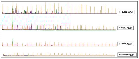 DNA extracts from samples that would not have been further examined were instead PCR-amplified after being concentrated approximately 8-fold. Figure 7 shows the results of the electropherograms, demonstrating the presence of amplification products in samples with theoretical concentrations of 0.002 and 0.001 ng/μL. Comparison with the genetic profile of the donors confirmed the correct typing, with the presence of drop-in and drop-out phenomena as expected (Figure 8). A sample with a concentration of 0.000 ng/μL did not yield any typing results, except for a single allele at D3S1358. Although these are preliminary results from a few samples, this method indicates concrete possibilities for successfully determining genetic profiles even from samples containing very few cells which may not be detected by a quantitative test.