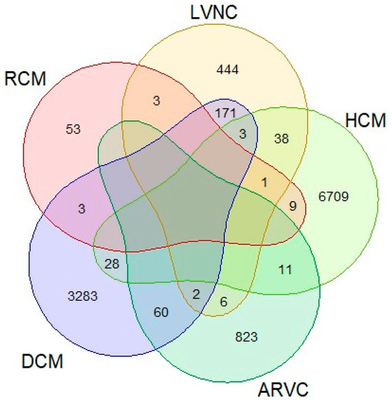 All patients were referred by clinical specialists for study, indicating confirmed or probable involvement of cardiomyopathy: 6799 HCM, 3550 DCM, 902 ARVC, 668 LVNC, and 69 RCM. Sometimes, several overlapping phenotypes were indicated for the same patient (Figure 1).