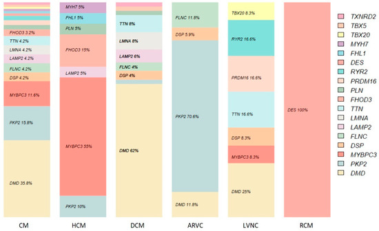 For HCM, 55% (11) of the associated CNVs involved the MYBPC3 gene. For DCM, 62% (31) affected the DMD gene; in addition, 71% of CNVs in ARVC corresponded to PKP2. For LVNC, the CNVs (11) were not as concentrated in one gene, with 27% in DMD and 17% in TTN, RYR2 (exon 3 deletion), and PRDM16. Finally, the CNV detected for RCM affected the DES gene. Figure 3 shows the percentages discussed extended to all CNVs and according to the frequency table.