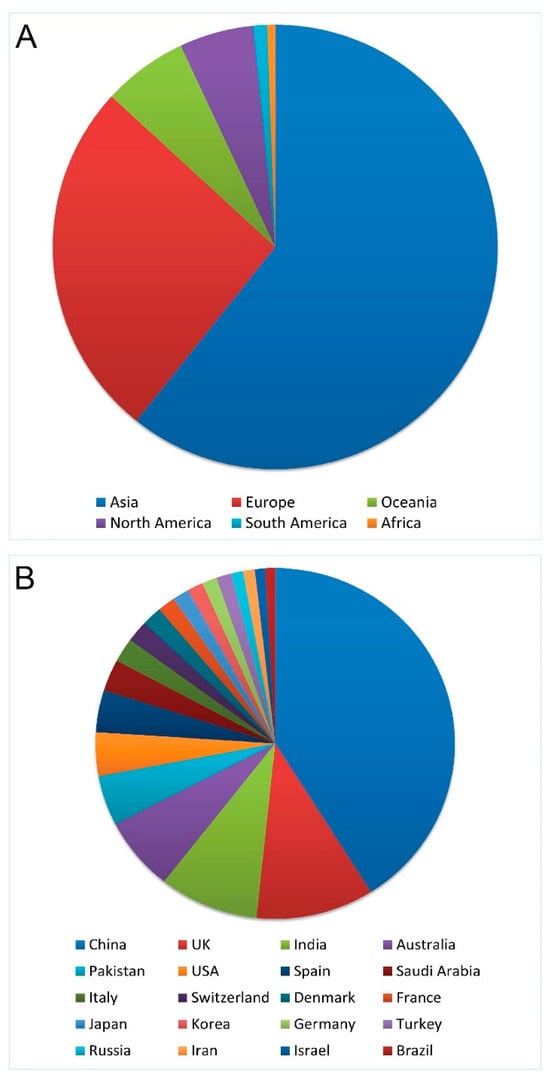 Schematic summarizing the geographic distribution of cataract genetics entries listed in Cat-Map by continent of origin (A) and by country of origin with 10 or more entries (B).