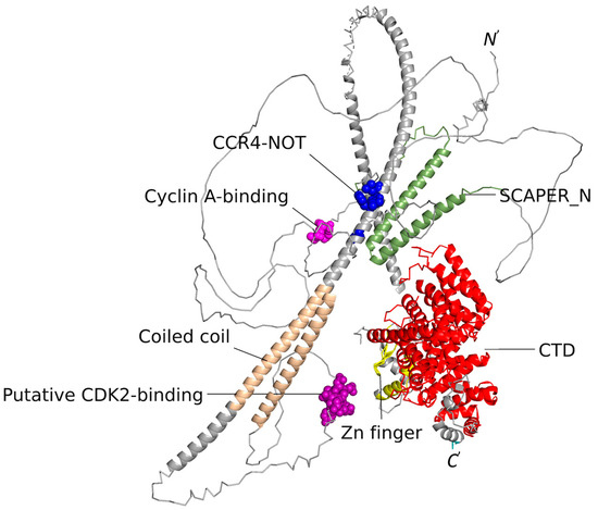 The AlphaFold2-predicted model of the SCAPER protein. The parts predicted with a confidence of 70% or higher are shown as thick ribbons and the rest of the protein is shown as a thin line. The protein is colored in grey, with functional domains colored as follows: the SCAPER_N domain (positions 90–183) is colored in green, the RSL cyclin A-binding motif is in pink (199–201, shown as spheres), the zinc finger residues (792–812) are colored yellow, and the C-terminal domain (CTD, positions 859–1357) is colored in red. The protein also contains a coiled coil region (colored wheat), whose function is still unknown. E620, F628, I629, and L632, which were implicated by Höpfler and co-workers [25] in CCR4–NOT complex binding, are shown as blue spheres. Finally, a putative CDK2-binding region, predicted by us (see below), is shown as magenta spheres.