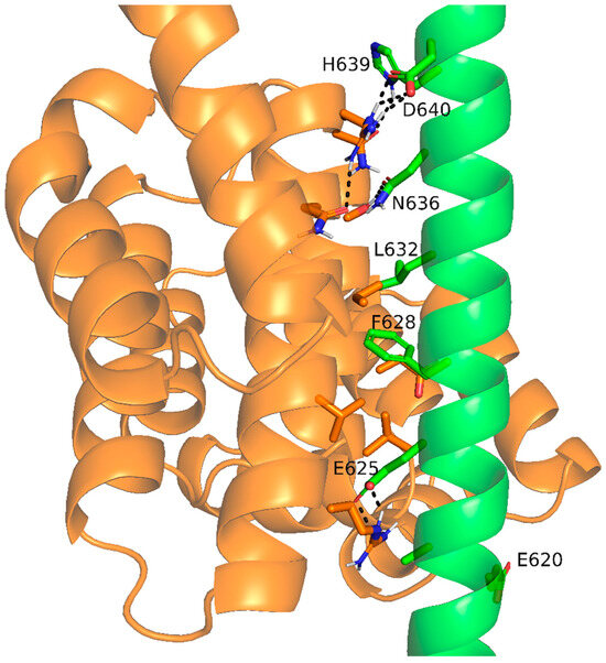In the study by Hedge and co-workers, the authors used AlphaFold-Multimer to characterize the interaction between SCAPER and the CNOT11 component of CCR4-NOT [25]. Their calculations suggested that residues E620, F628, I629, and L632 in the long helix of SCAPER are the binding sites of the CNOT11. Our AlphaFold-Multimer calculations with human CNOT11 (UniProt ID Q9UKZ1) support these results, yet they extend SCAPER’s CNOT11-binding region to position 640. Indeed, this part of SCAPER is highly conserved, with 90% of the positions having the maximal ConSurf score. The interaction between this part of SCAPER and CNOT11 includes multiple hydrophobic contacts, hydrogen bonds involving E625, H639, and D640, and salt bridges involving E625 and D640 (Figure 4).
