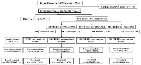 A total of 3744 BC cases were extracted from the C-CAT database, which enrolled 60,250 patients between June 2019 and October 2023. Of the 3744 BC cases, 418 were excluded from the analysis because of a lack of information about HR and HER2 status. A total of 3326 cases were classified into four subtypes according to C-CAT information on ER, PR, and HER2 status (Figure 1). Based on the expression of ER, PR, and HER2, TNBC was defined as HR−/HER2−. A total of 134 TNBC cases, 221 HR+/HER2− cases, 26 HR+/HER2+ cases, and 20 HR−/HER2+ cases were excluded from the analysis of treatment attainment rates and treatment achievement rates because of a lack of clinicopathologic information.