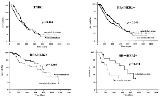 Prognoses were compared between patients treated by the proposed therapy and those without such treatment (Figure 3). Among TNBC cases, there was no significant prognostic difference between these groups (p = 0.464). On the other hand, in HR+/HER2− cases, the median OSs in the administration and non-administration groups were 468 days and 343 days, respectively. The prognoses of HR+/HER2− cases were significantly (p = 0.044) better in the treated group, whereas among HR+/HER2+ and HR−/HER2+ cases there was no significant difference between the treated and untreated groups.