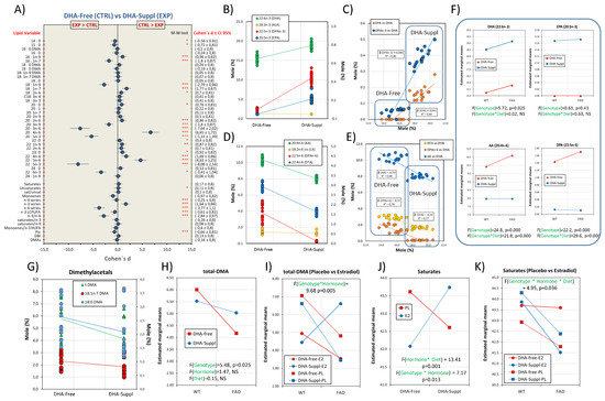 Frontal cortex fatty acid profiles are differentially affected by the dietary condition, the presence of FAD genotype and circulating estrogens: multifactor analyses. (A) Forest plot for effect sizes (Cohen’s d) in fatty acids and related indexes between DHA-Free and DHA-Suppl diets. Cohen’s d values are indicated along with their 95% confidence intervals. Lipid variables were also submitted to Mann–Whitney U tests. *, **, and *** indicate p-values below 0.05, 0.01, and 0.005, respectively. (B) Plots for frontal cortex contents of DHA, ALA, DPAn-3, and EPA in DHA-Free and DHA-Suppl diets. (C) Regression analyses for EPA and DPAn-3 as a function of DHA contents. Standardized regression coefficients (β) for each regression line are indicated along with the corresponding determination coefficient (R2). (D) Plots for frontal cortex contents of AA, LA, DPAn-6, and DTA in DHA-Free and DHA-Suppl diets. (E) Regression analyses for DTA, DPAn-6, and AA as a function of DHA contents. Standardized regression coefficients (β) and determination coefficient (R2) for each regression line. (F) Estimated marginal means for DHA, EPA, AA, and DPAn-6 as a function of the mouse genotype (WT and FAD). F- and p-values for genotype as the main factor, as well as for the interaction with the diet factor (Genotype*Diet), are shown at the bottom of each plot. (G) Plots for frontal cortex contents of different dimethylacetals, and total (t-DMAs) in DHA-Free and DHA-Suppl diets. (H) Estimated marginal means for total dimethylacetals (total-DMAs) as a function of the mouse genotype. F- and p-values for genotype, hormonal treatment and diet as main factors are indicated at the bottom of the graph. (I) Estimated marginal means for total-DMAs as a function of the mouse genotype, hormonal treatment, and dietary intervention. (J) Estimated marginal means for total saturates as a function of diet and hormonal treatment. F- and p-values for hormonal interactions with genotype (Hormone*Genotype) or diet (Hormone*Diet) are indicated at the bottom of the graph. (K) Estimated marginal means for total saturates as a function of genotype, hormonal treatment, and dietary condition.