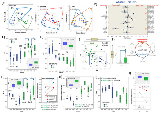 Multifactor analyses of frontal cortex lipid classes. (A) Scatterplots of factor scores from PC1 and PC2 with identification of main factor categories (genotype: WT and FAD; hormonal treatment: placebo and estradiol; dietary condition: DHA-Free and DHA-Suppl). (B) Forest plot for effect sizes (Cohen’s d) in lipid classes and related indexes between WT and FAD genotypes. Cohen’s d values are indicated along with their 95% confidence interval. Lipid variables were also submitted to Mann–Whitney U tests. *, **, and *** indicate p-values below 0.05, 0.01, and 0.005, respectively. (C) Boxplots for phosphatidylcholine (PC) contents in the eight experimental groups. * p < 0.05 between bars indicated by the arrows. In the inset, comparison of WT and FAD pooled subgroups. M-W: Mann–Whitney U test. (D) Boxplots for phosphatidylethanolamine (PE) contents in the eight experimental groups. * p < 0.05 between bars indicated by the arrows. In the inset, comparison of WT and FAD pooled subgroups. M-W: Mann–Whitney U test. (E) Regression plot for PC and PE contents in FAD and WT animals. Standardized regression coefficient (β) and determination coefficient (R2) of regression analyses for the whole dataset are indicated in the plot. (F) Boxplot representation for lysophosphatidylcholine (LPC) contents in WT and FAD groups. Sketch drawing of Land’s cycle showing lysophospholid formation. (G) Boxplots for total phospholipid (PLT) contents in the eight experimental groups. *, ** indicate p < 0.05 and p < 0.01 between bars indicated by the arrows. In the inset, comparison of WT and FAD pooled subgroups. M-W: Mann–Whitney U test. In the right graph, estimated marginal means for total phospholipids (PLTs) as a function of mouse genotype and hormonal treatment. F- and p-values for genotype, hormonal treatment and diet as main factors are indicated at the bottom of the graph. (H) Boxplots for anionic-to-zwitterionic ratio in the eight experimental groups. F- and p-values for genotype and diet as main factors are indicated at the bottom of the graph. In the inset, comparison of WT and FAD pooled subgroups. M-W: Mann–Whitney U test. (I) Effects of genotype and diet in the distribution of cholesterol (CHO) contents. Box plots for CHO contents in the eight experimental groups. F- and p-values for genotype and diet as main factors are indicated at the top of the graph. (J) Upper graph: comparison of WT and FAD pooled subgroups. M-W: Mann–Whitney U test. Lower graph: estimated marginal means for CHO as a function of mouse genotype and dietary treatment. In (C,D,G–I), different letters in bars within the same plot indicate statistical differences with p < 0.05 (Tuckey’s post hoc test). Experimental groups: APF: APP/PS1-Placebo-DHA-Free; APS: APP/PS1-Placebo-DHA-Suppl; AEF: APP/PS1-Estradiol-DHA-Free; AES: APP/PS1-Estradiol-DHA-Suppl; WPF: Wild-type-Placebo-DHA-Free; WPS: Wild-type-Placebo-DHA-Suppl; WEF: Wild-type-Estradiol-DHA-Free; WES: Wild-type-Estradiol-DHA-Suppl.