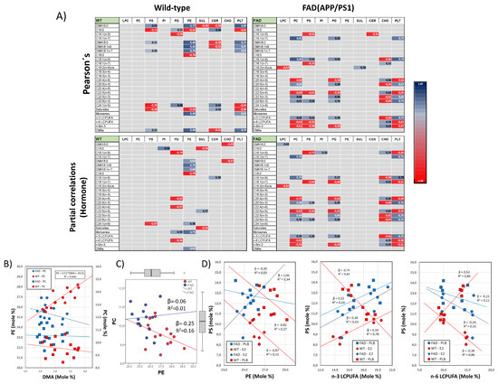 Empirical evidence for phospholipid remodeling in the frontal cortex. (A) Analyses of Pearson’s correlation (upper matrixes) and partial correlation controlling for hormonal condition (lower matrixes) for lipid classes and fatty acids in WT and FAD animals. Only significant correlation values are indicated in the tables, and they are colored according to the scale on the right. (B) Regression analyses for the relationships between PE or PC and total DMA contents. Regression equation and R2 are shown for only the significant linear association found (PE vs. DMAs in WT animals). (C) Analyses of bivariate association between PC and PE in WT and FAD animals. (D) Regression analyses for PS as a dependent variable and PE (left), n-3 LCPUFAs (middle) and n-6 LCPUFAs (right) as independent variables. Regression (β) and determination coefficients (R2) are indicated for each regression line in the plots.