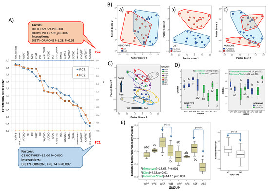 Results shown in Figure 1 showed that, besides fatty acids, lipid classes were also unevenly distributed over PC1, PC2 and PC3. Detailed examination of PC1 and PC2 (42.7% cumulative overall variance) indicated that both phospholipids and cholesterol exhibited highest extraction coefficients. Thus, in PC1, glycerophospholipids (PC, PS and PG) and cholesterol were oppositely related, while in PC2, PE and PI displayed opposed representation. Two-way ANOVA showed that the main effect was the genotype (F1,40 = 38.32, p = 0.000), followed by hormonal treatment (F1,40 = 14.13, p = 0.001) and lowest influence of diet (F1,40 = 9.64, p = 0.008) on PC1, without significant interactions between either factor (Figure 3A). Only for PC2 was a significant interaction observed for the genotype and hormonal status (F1,40 = 18.31, p = 0.000), which, in turn, were also very significant as main factors (hormonal treatment F1,40 = 13.23, p = 0.001; genotype F1,40 = 12.09, p = 0.002). Noticeably, the dietary contribution to factor scores was the lowest (in PC1) or null (in PC2). However, a certain influence of dietary condition for factor score 2 could be detected at the level of interaction between the three factors (F1,40 = 4.41, p = 0.046). These results indicate the selective modulation of frontal cortex lipid classes by the FAD genotype and not by dietary conditions, which dramatically differ from results of frontal cortex fatty acids. Such radical differences may be explained in terms of distinct biosynthetic scenarios, i.e., most LCPUFAs in brain tissue derive from liver biosynthesis or intestinal absorption (in the case of DHA-supplemented diets), and routed to the brain across the BBB, while lipid classes, particularly glycerophospholipids, cholesterol, and sphingolipids, are synthetized locally in nerve cells.