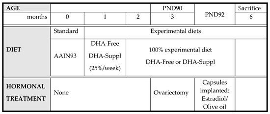 DHA-free and -supplemented diets were prepared by Harlan Laboratories (Barcelona, Spain), and their compositions are shown in Supplementary Materials Table S1. One month after weaning, diets were gradually replaced with a DHA-free or DHA-supplemented diet at a rate of 25% per week. At postnatal day 90 (PND90), animals were ovariectomized, and 48 h later (PND92), they were implanted subcutaneously with synthetic capsules (Innovative Research of America, Sarasota, FL, USA) containing either estradiol (0.05 mg estradiol acetate/pellet) or a vehicle (olive oil). Six months after birth, mice were sacrificed by cervical dislocation. Blood samples were immediately obtained from the abdominal cava and centrifuged at 3000 rpm for 20 min at 4 °C, and the plasma fraction was collected and stored, frozen at −20 °C until assay. Brain frontal cortexes were dissected and frozen in liquid nitrogen until analysis. All experimental manipulations were performed following the procedures authorized by the Ethics Committee for the manipulation of laboratory animals at the University of La Laguna (Spain) following the guidelines of the European Community Council (Directive 86/609/EEC).
