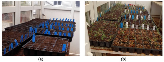 The stages of artificial infection of chickpea with Fusarium in the greenhouse. (a) Sowing; (b) Seedling stage; (c) Fusarium artificial infection of seedlings; (d) Replanting of seedlings into pots.