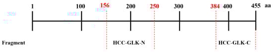 Schematic diagram of HCC-GLK full-length and truncated fragment proteins. The truncation positions are shown with red dashed lines.