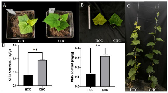 Phenotype and chlorophyll content of the allotriploids. (A) Phenotype of HCC and CHC at the seedling stage. (B) The fourth true leaves of HCC and CHC. (C) Phenotype of HCC and CHC at the outcome stage. (D) Chlorophyll content of HCC and CHC. ** p < 0.01.