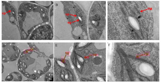 Chloroplast ultrastructure of triploids in Cucumis. (A–C) Chloroplast structure abnormalities in HCC. (D–F) Chloroplast structure in CHC, which is well developed. Note: sg, starch granule; cp, chloroplast; TM, thylakoid lamellae.