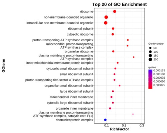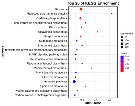 Differentially expressed genes were subjected to GO analysis. Further enrichment analysis showed that these differential genes were significantly enriched in structural constituents of ribosomes, structural molecular activities, heme binding, and other pathways (Figure 4). Among those related to leaf color are heme binding and the tetrapyrone combination pathway. Thus, it could be inferred that leaf yellowing was related to all these factors. KEGG analysis (Figure 5) revealed that the predominant processes are involved in ribosomes, photosynthesis antenna proteins, etc. The pathway with the highest enrichment factor was that for photosynthesis antenna proteins (with a value of 0.632), in which 12 genes were annotated. These results indicate that the production of yellowed leaves in HCC is closely related to photosynthesis.