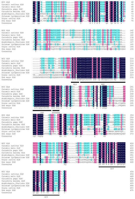 The homologous sequences of melon, pumpkin, cantaloupe, Arabidopsis, tomato, rice, and corn were retrieved from the NCBI database, and then an alignment analysis of the homologous amino acid sequences was performed. The results show that there is a certain degree of variation in the GLK amino acid sequence among different species, but the key structural domains (DBD, AREAEAA, and GCT) are relatively conserved (Figure 7). Through comparison, it was found that HCC-GLK and CsGLK had the highest homologous sequence similarity.