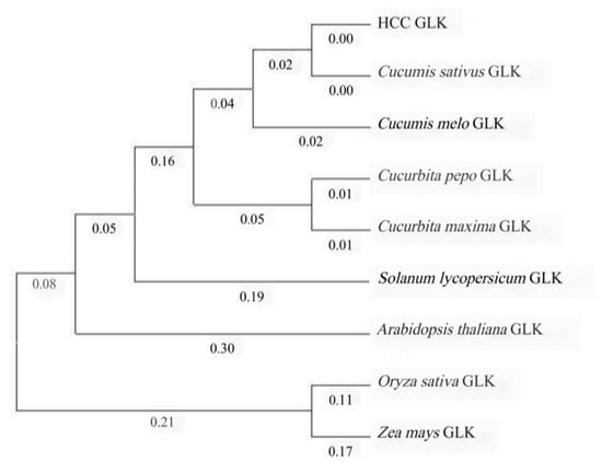 Homologous protein sequences of HCC-GLK in different species were compiled into text documents and then imported into MEGA 7.0 to construct a biological evolutionary tree to further study the relationship between different species. The phylogenetic tree was constructed, and it was found that HCC-GLK has the closest genetic relationship with cucumber, followed by melon (Figure 8). Conversely, the most distant genetic relationship was observed with corn and rice.
