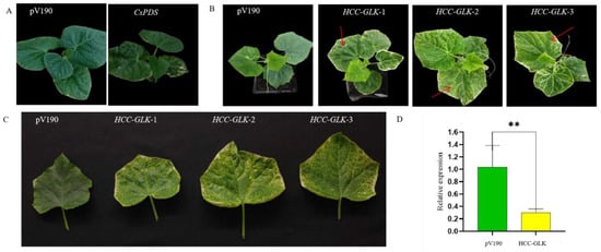 VIGS validation and qRT-PCR analysis. (A) Phenotypes of plants silenced by PDS gene through VIGS. (B) Phenotypes of plants silenced by the HCC-GLK gene through VIGS. (C) Leaf yellowing in plants silenced by the HCC-GLK gene through VIGS. (D) Quantitative RT-PCR analysis of HCC-GLK, Pv190:GLK-silenced plants and Pv190 plants. ** p < 0.01.