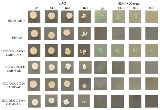 This study assumed that there may exist some protein-level interactions between the HCC-GLK protein and light-harvesting chlorophyll a/b binding proteins. To accomplish this, light-harvesting chlorophyll a/b binding proteins (CAB3C and CAB40) were inserted into PGADT7 and PGBKT7 vectors, respectively. HCC-GLK-N-BD+CAB3C-AD, HCC-GLK-N-BD+CAB40-AD, HCC-GLK-C-BD+CAB3C-AD, and HCC-GLK-C-BD+CAB40-AD were selected as the experimental groups, and BD+AD and AD-T+BD-53 were used as the control groups. The empty combination was used as the negative control group for yeast two-hybrid point-to-point validation.