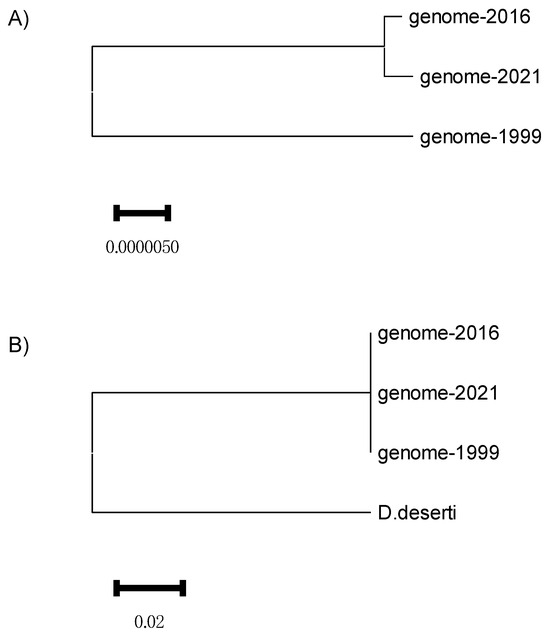 We compared the genomes of three D. radiodurans strains that have diverged during processes of growth and storage in different laboratories. These genomes will be referred to as genome-1999, genome-2016, and genome-2021 according to the year in which they were published (see Section 2). The phylogenetic tree shows that genome-2021 and genome-2016 are very closely related and genome-1999 is more distant (Figure 1A). However, these are very small distances, which become unnoticeable when these genomes are compared to a closely related outgroup such as Deinococcus deserti (Figure 1B). This is expected since the three investigated strains of D. radiodurans originate from the same recent (1956) isolate. Throughout Section 3 and Section 4, if genome-2016 is not specifically mentioned, it means that its structure corresponds to the structure of genome-2021, as would be expected from their phylogenetic closeness (Figure 1).