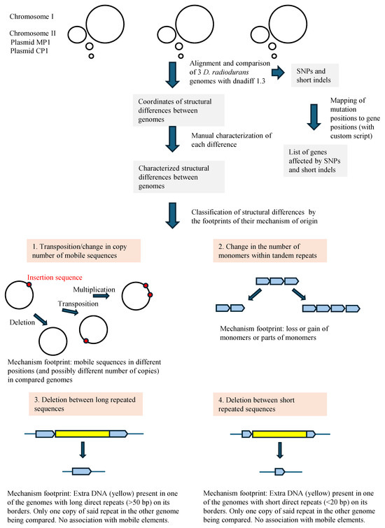Workflow of our analysis, with graphical representations of detected types of structural genome change in D. radiodurans.