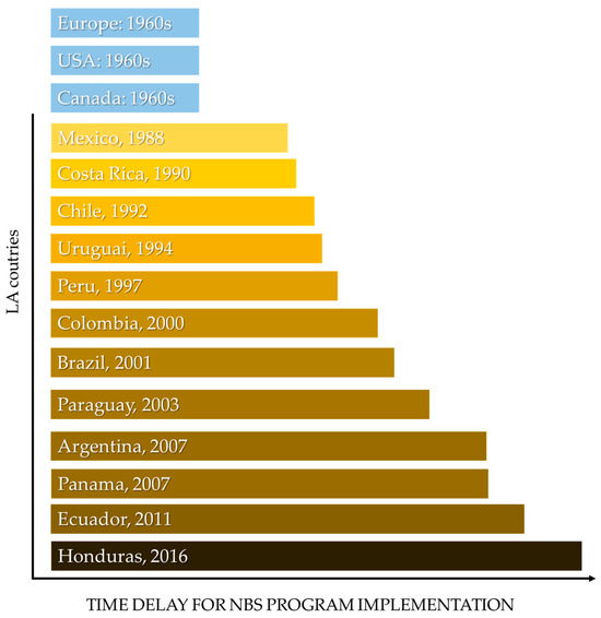 The LAC has a population of approximately 669,416,054 million people distributed across 33 countries with marked political, cultural, social, economic, and healthcare system differences [29,30]. The introduction of NBS has experienced significant implementation time differences in each of their countries, probably related to a combination of unique economic, technical, logistical, social, cultural, and political challenges [24,25,31,32].