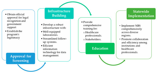 Therefore, we conclude that several of these experiences and advancements should also apply to different governments and countries, and it is essential to discuss and incorporate them into the strategic planning of other countries in the process of implementing the 5q-SMA NBS. The four critical phases for the success of establishing a robust NBS program are described in Figure 2 [52].