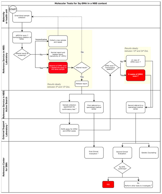In the case of 5q-SMA NBS, the São Paulo state pilot study has been conducting a qualitative real-time PCR test (first tier) and employing the MLPA for SMN1/SMN2 as a second-tier test (data to be published-personal information Romanelli Tavares 2014). Concerned with early cases of 5q SMA, alongside the confirmatory test sample collection, the newborn found altered at the first-tier test is promptly referred to a specialized center for a comprehensive clinical evaluation to identify and address any potential symptoms requiring specific interventions, such as respiratory care. It is noteworthy that a patient with an abnormal screening test (lack of SMN1 exon 7) and classic symptoms of early 5q-SMA may require immediate interventional therapy upon clinical decision. Both symptomatic and asymptomatic patients undergo a second clinical evaluation after the release of MLPA results, which complements treatment decisions based on the evaluation of SMN2 copy number. It is also important to highlight that some services may be able to perform the confirmatory test using the sample already collected on the paper filter. This is possible with a standardized protocol for DNA extraction followed by MLPA for SMN1 and SMN2 [65].