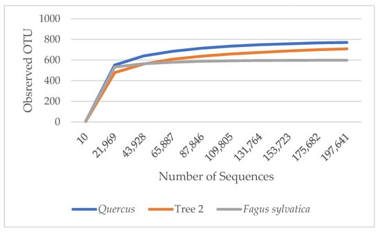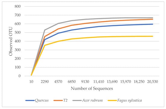α diversity is used to reflect the diversity of each sample, which estimates the number of species in the microbial community and the abundance and diversity of species in environmental communities. The rarefaction curves in Figure 1 show the number of species in each sample. The curves demonstrated that the numbers of sequences analyzed were sufficient to predict species abundance. A. rubrum showed the highest diversity, followed by T2, Quercus, and F. sylvatica.