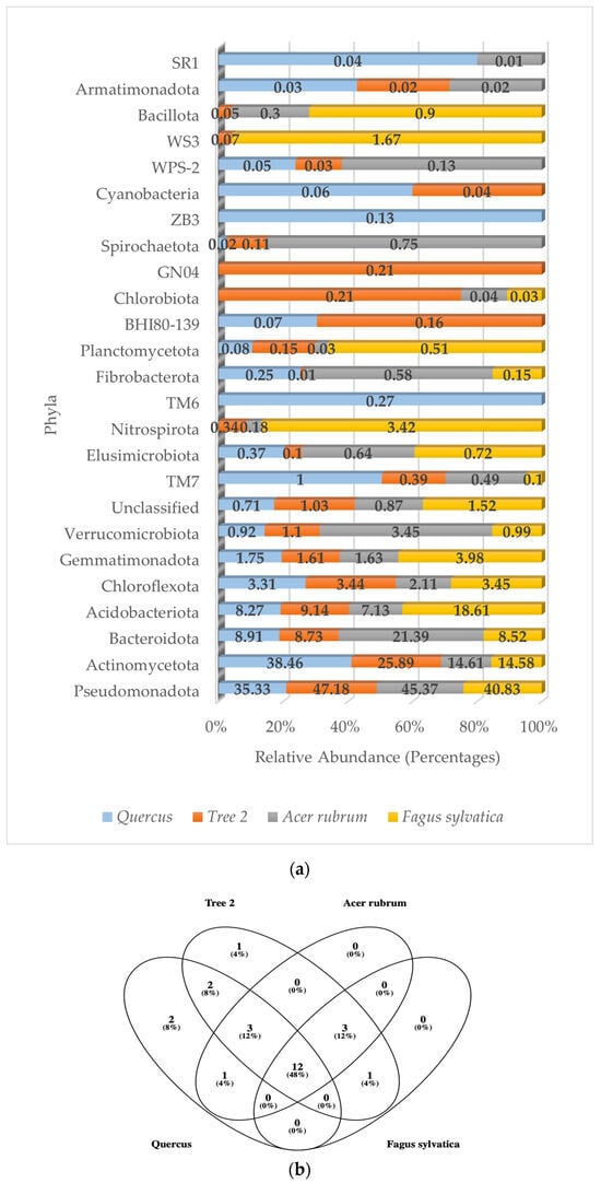 Amplicon analysis of the rhizosphere microbiome using ribosomal genes was performed to ascertain the community structure, diversity, and abundance of bacteria and fungi in all four trees. Similarity values demonstrated that the bacterial communities from each tree became more different when lower taxonomical levels, such as orders and genera, were analyzed. At the phylum level, the Proteobacteria dominated the rhizosphere bacterial communities of F. sylvatica, A. rubrum, and T2. The rhizosphere of Quercus was the only one with Actinomycetota as the main phylum, followed by Pseudomonadota. Pseudomonadota bacteria orders and genera were more dominant in all trees. These bacteria are known to be capable of diverse metabolic activities, such as nitrogen fixation, organic matter decomposition, nutrient mobilization, plant growth promotion, etc. [1,11,14,23]. Actinomycetota orders and genera were also widely distributed and were commonly associated with organic matter decomposition, secondary metabolites production, organic matter decomposition, plant growth promotion, etc. Both bacterial phyla were previously shown to be major contributors in the rhizosphere of Quercus and F. sylvatica [1,25].
