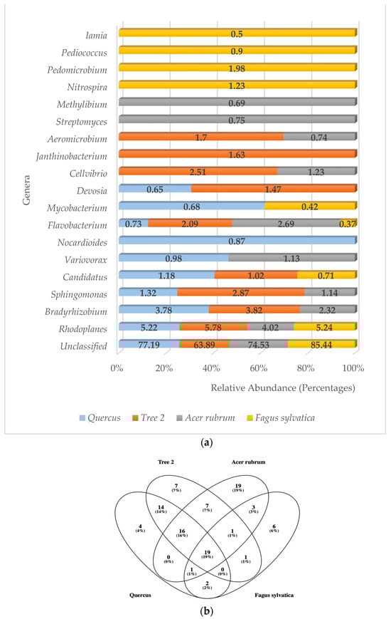 A total of 67 genera were detected in the rhizosphere. A. rubrum showed the highest number of genera (67), followed by Tree 2 (65), Quercus (56), and F. sylvatica (33), respectively. Unclassified bacterial genera were found to be the number one type in all trees with an average of 76.26% (Figure 3a). The phylum Pseudomonadota had more genera with high levels of relative abundance. These were Rhodoplanes, Bradyrhizobium, Sphingomonas, Variovorax, Devosia, Cellvibrio, Janthinobacterium, Methylibium, Pedomicrobium, and Mesorhizobium, followed by the Actinomycetota (5) (Iamia, Streptomyces, Aeromicrobium, Nocardioides, Mycobacterium), Bacteroidota (1) (Flavobacterium), and Nitrospirota (1) (Nitrospira).