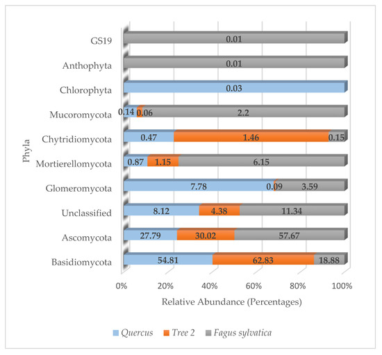 Seven out of the ten phyla were detected in all trees. They were unclassified sequences, Ascomycota, Basidiomycota, Glomeromycota, Mortierellomycota, Chytridiomycota, and Mucoromycota. The phyla Anthophyta and GS19 were only present in F. sylvatica, while Chlorophyta was only detected in Quercus.