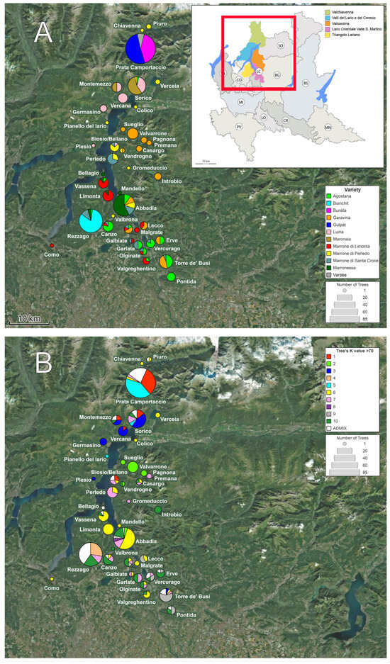 Satellite map of the Lario region, Lombardy, Italy, and sampling municipalities. Circle size represents number of trees. (A) Pie charts show the chestnut variety sampled at each location; colours are consistent with Figure 2. (B) Pie charts show the proportions of ancestral gene pools of origin for each studied population. The colours match those of the bar chart in Figure 1A,B.