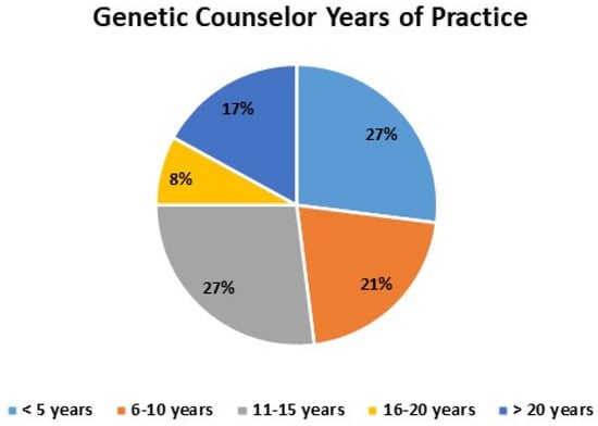 In total, data were available from 52 GCs with a response rate of 43% (52/120), 67% (35/52) from CHOP and 33% (17/52) from Penn. In total, 27% (14/52) were practicing GCs for less than 5 years, 21% (11/52) had 6–10 years experience, 27% (14/52) had 11–15 years experience, 8% (4/52) had 16–20 years experience, and 17% (9/52) had greater than 20 years experience (Figure 4).