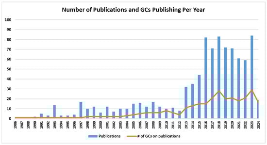 Numbers of unique publications per year and number of GC authors that year. Number of publications in the medical literature with at least one genetic counselor included as an author. With minimum increase in GCs publishing the number of publications increased some years 3-fold. 2024 data collected stopped as of 5 February.