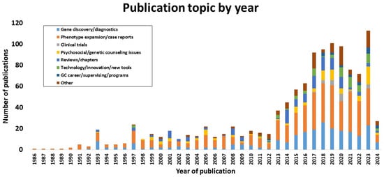GCs contributed to almost 1000 publications in the scientific literature across a 38-year span (1986–2024; Figure 5), with 9% (89/992) of manuscripts published in 2023 and 19 accepted for publication from 1 January to 5 February 2024. Of note, the number of publications increased considerably after 2013 as no less than 32 manuscripts were published yearly, culminating with a maximum of 89 publications in 2023. When analyzing this against the number of GCs who were active in research, impressively, in most years post-2012, the number of publications was triple the amount of GC authors. These data show that, in 2023, from our cohort, 56% (29/52) of GCs who responded published that year. This has been steadily above 35% (18/52) of respondents since 2017. The impact factor varied annually but typically averaged >5.0. One hundred and eighty-four (19%) papers were published in journals with impact factors >10.0, 24 (2%) were published in journals with impact factors of >20, and 11 (1%) were published in journals with impact factors of >30. Similarly, areas of focus gradually became more diverse, although expansion of phenotypes/case reports was the most common topic overall. However, since 2015, a shift towards gene discovery/diagnostics, clinical trials, and reviews has been observed (Figure 6).