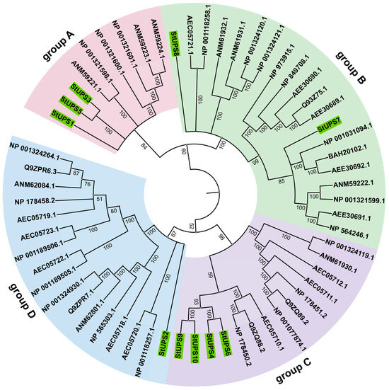 Figure 2. Phylogenetic tree of UPS proteins in potato and Arabidopisis thaliana. Groups A–D are distinguished by different color markings. UPS in potato highlighted with green markers.