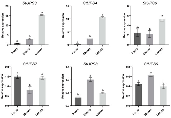 Figure 8. Expression analysis of six StUPS genes selected in roots, shoots, and leaves. Analyzing three measurements to obtain error bars. Different letters above bars indicate significant differences between tissues (p < 0.05).