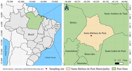 Location map of the municipality of Santa Bárbara do Pará demarcating the collection site of the investigated species. This Figure was created using the software QGIS v.3.10.4 (available at https://qgis.org/en/site/, accessed on 30 March 2024) in conjunction with the IBGE 2022 cartographic database (available at https://www.ibge.gov.br/, accessed on 30 March 2024).