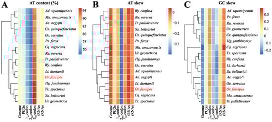 (A) AT% composition, (B) AT-skew, and (C) GC-skew of 16 previously characterized mosquito mtDNAs, including Or. fascipes (highlighted in red). Hierarchical groupings (clusters) of species (y-axis) are established based on the quantity of each metric per region evaluated (x-axis). The scales, particularly AT-skew and GC-skew, consider the real (non-normalized) values obtained in each analysis.