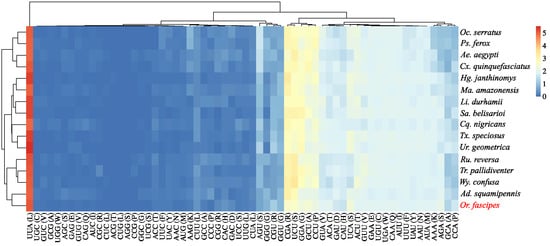 Relative use of synonymous codons of Or. fascipes (highlighted in red) in comparison to other representatives of the Culicinae subfamily. Hierarchical groupings (clusters) of species (y-axis) are established based on the RSCU of each codon (x-axis), with indications regarding the scale values.