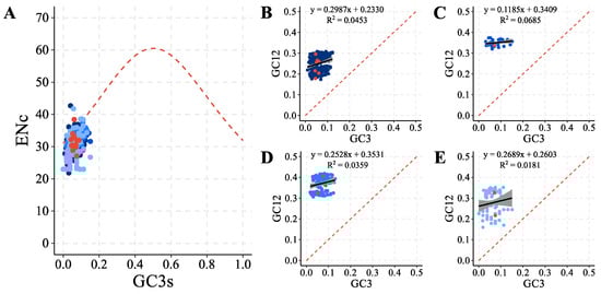 (A) ENc-GC3s graph. The red dashed line indicates the curve expected when codon usage bias is affected only by mutation pressure. GC12-GC3 neutrality plots are arranged in the order of mitochondrial complexes: (B) I (NADH), (C) III (Cytb), (D) IV (COX), and (E) V (ATP). In the graphs, each blue point (varying in tone according to the complex) represents a PCG independent of the Culicinae mtDNAs used as a reference in the analyses. PCGs of Or. fascipes are highlighted in red.
