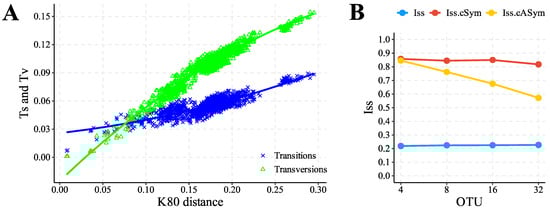 Analysis of nucleotide substitution saturation of the set of sequences evaluated resulted in the transition and transversion rates being linearly associated with genetic distance (Figure 7A). Furthermore, based on the test proposed by Xia et al. (2003) [], performing multiple randomizations on subsets of 4 to 32 operational taxonomic units (OTUs) resulted in a saturation index (Iss) significantly lower (p = 0.00001) than the critical value (Iss.c), both for symmetric topologies (Iss.cSym) and asymmetric (Iss.cAsym) (Figure 7B), indicating the unsaturation of the set of sequences evaluated, and qualifying it for phylogenetic reconstruction analysis.