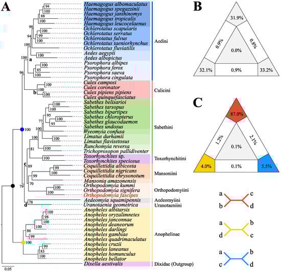 (A) Phylogeny reconstructed using the Maximum Likelihood method based on the 13 PCGs of Or. fascipes (highlighted in red) and other taxa available in the GenBank repository (NCBI). Bootstrapping support values (BS) are shown on each node. The colored dots indicate the main reconstructed taxonomic groupings: family Culicidae (black) and subfamilies Culicinae (blue), and Anophelinae (yellow). (B) Maximum Likelihood mapping diagram demonstrating the quality of the phylogenetic signal resulting from the quartet analysis, with 98.2% resolved quartets. (C) Four-cluster likelihood mapping (FcLM) diagram representing four taxon groupings in Culicinae. The analyzed groups are indicated in the topology by the letters “a” (Aedini), “b” (Culicini), “c” (Orthopodomyiini + Mansoniini + Toxorhynchitini + Sabethini), and “d” (Aedeomyiini + Uranotaeniini). The bidirectional arrows indicate different hypotheses regarding the relationships among the four clusters, with their respective colors in the diagram corresponding to the support percentages.