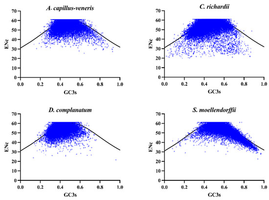 The distribution of the gene ENC of the four species ranged from 20 to 61, with an average ENC of 50.0 to 53.5 (Table 1). Using ENC = 35 as a criterion for distinguishing the strength of preference, there are 59 A. capillus-veneris genes with ENC < 35, accounting for 1.12% of the total. The C. richardii gene has 552 entries with ENC < 35, which is 3.92% of the total. The D. complanatum gene has 41 entries with ENC < 35, representing 0.30% of the total. The 175 entries with ENC < 35 in the S. moellendorffii gene represented 3.23% of the total. In summary, S. moellendorffii has the strongest codon usage bias and D. complanatum has the weakest codon usage bias compared to the other species. The codon preferences of the four species genes are weak overall, and only a few genes have codon preferences, but there are still differences in codon use preferences among different genes.