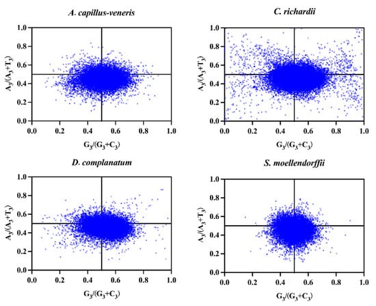 The whole-genome sequences of the four screened plants were analyzed by Codon W [39]. After removing non-synonymous codons and termination codons from the sequences, we found that the T3 and A3 contents were higher than the C3 and G3 contents in A. capillus-veneris, C. richardii, and D. complanatum (Table 2). This shows that among the synonymous codons encoding amino acids, the third base of the codon of A. capillus-veneris, C. richardii, and D. complanatum are mainly dominated by the A/U ending. In S. moellendorffii, the G3 and C3 contents were higher than the A3 and T3 contents, indicating that the third base of the codon in the synonymous codon coding for amino acids tended to end with C/G.