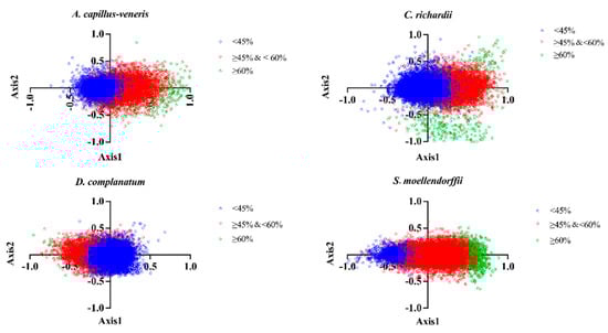 Axis 1 occupancy is the most significant effect factor contributing to the variation. In addition, genes were labeled in blue (GC% < 45%), red (GC% ≥ 45% & <60%), and green (GC% ≥ 60%) to explore the effect of the size of the GC content on codon usage preference. No species showed obvious genetic separation in the range of GC content between 45 and 60% and GC content below 45%; A. capillus-veneris, C. richardii, and D. complanatum had a few genes with a GC content greater than or equal to 60%. The difference is that in D. complanatum, genes with GC% < 45% are located on the right side of the axis, while genes with GC content between 45% and 60% are located on the left side of the axis; the opposite is true for the other three species. Meanwhile, genes with a GC content greater than or equal to 60% in C. richardii showed a relatively dispersed distribution. These phenomena show that the process of codon usage bias formation in the genomes of the four species is complex, and the factors affecting the formation of codon usage bias in different species are not unique.