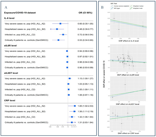 - Larsson, S.C.; Burgess, S.; Gill, D. Genetically proxied interleukin-6 receptor inhibition: Opposing associations with COVID-19 and pneumonia. Eur. Respir. J. 2021, 57, 2003545. [Google Scholar] [CrossRef]