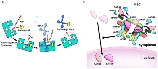 (a) Overview of the esterification reaction, catalyzed by aaRS proteins. (b) Roles of aminoacyl-tRNA synthetase-interacting multi-functional protein.