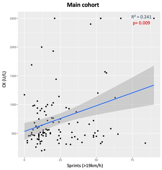 CK levels and number of sprints (>19 km/h) for all athletes in the main cohort.