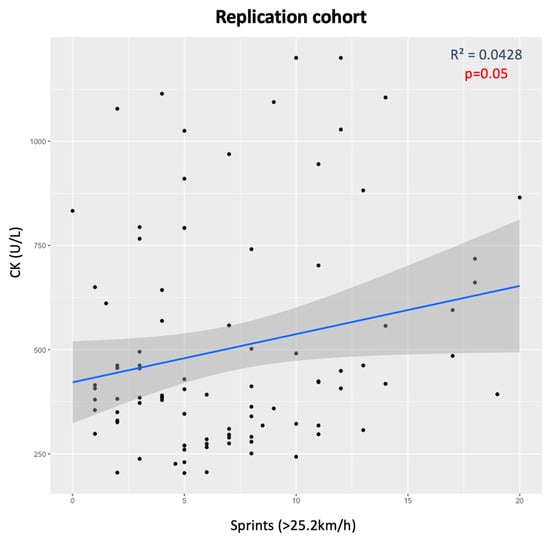 CK levels and number of sprints (>25.2 km/h) for all athletes in the replication cohort.